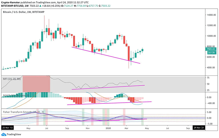 Trước đó, nhà giao dịch tiền điện tử @CryptoHamsterIO nhận định Bitcoin đã hình thành các phân kỳ giá tăng trên khung thời gian hàng tuần. Đó là các chỉ báo dòng tiền (Money Flow) , MACD và chỉ báo biến đổi của cá (Fisher Transform). Cả 3 chỉ số này đang được đẩy lên cao hơn.