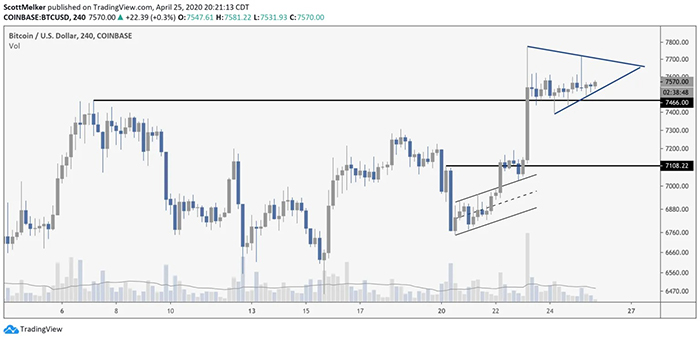Nhìn nhận ở góc độ ngắn hạn hơn, nhà giao dịch tiền điện tử @scottmelker đã đưa ra một biểu đồ trên twitter của mình. Trong biểu đồ cho thấy diễn biến giá của Bitcoin đã hình thành một tam giác cân. Điều đó cho thấy, cả phe mua và phe bán hiện tại vẫn đang tranh chấp và chưa định hình được xu hướng rõ ràng.