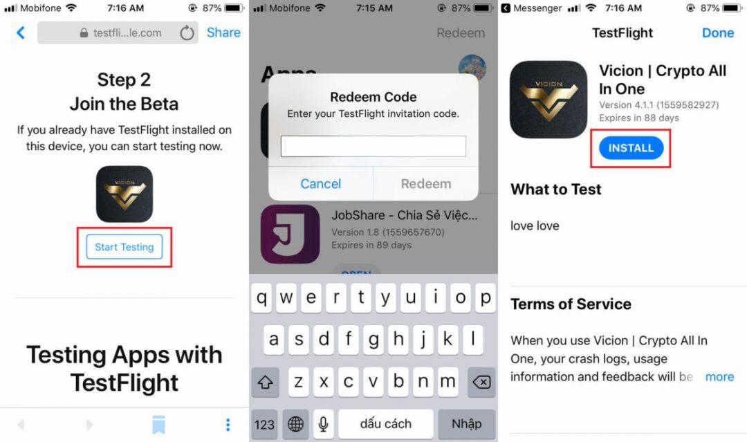 - Bước 2: Nhấn vào Link trên, bấm “Start Testing” (hình 1) => Nếu hiện ra màn hình yêu cầu nhập Redeem code (hình 2) thì tắt hoàn toàn TestFlight đi rồi thực hiện lại bước 2
