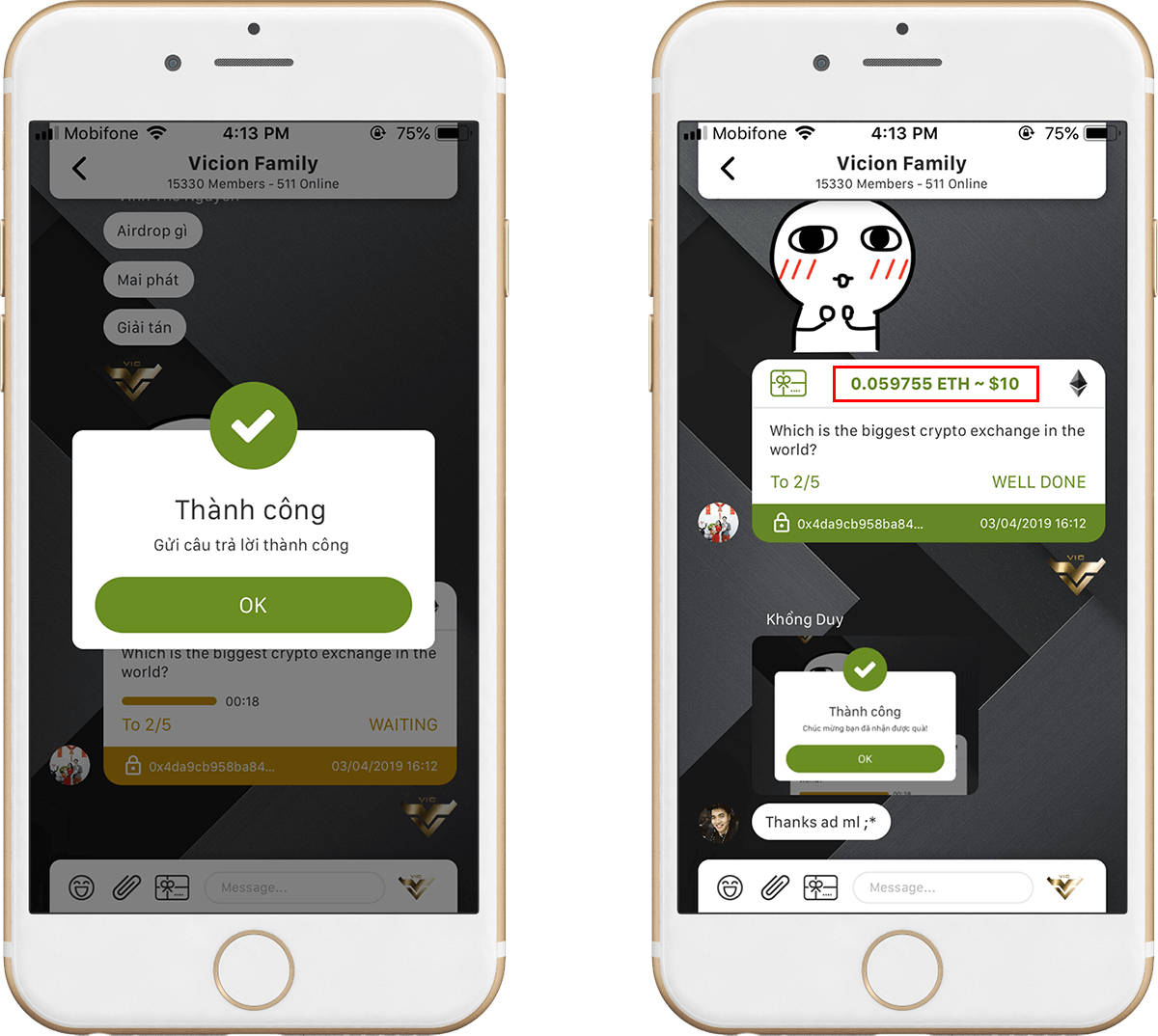 Câu trả lời chính xác và nhanh nhất sẽ nhận được token về thẳng ví thông qua Smart Contract.