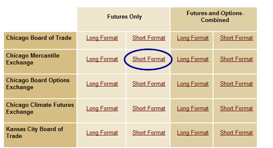 Sau khi đã truy cập vào trang, hãy kéo xuống dưới và tìm đến mục “Current Legacy Report” và nhấp vào “Short Format” nằm phía dưới cột Futures Only và thuộc hàng “Chicago Mercantile Exchange” để xem báo cáo COT gần đây nhất.