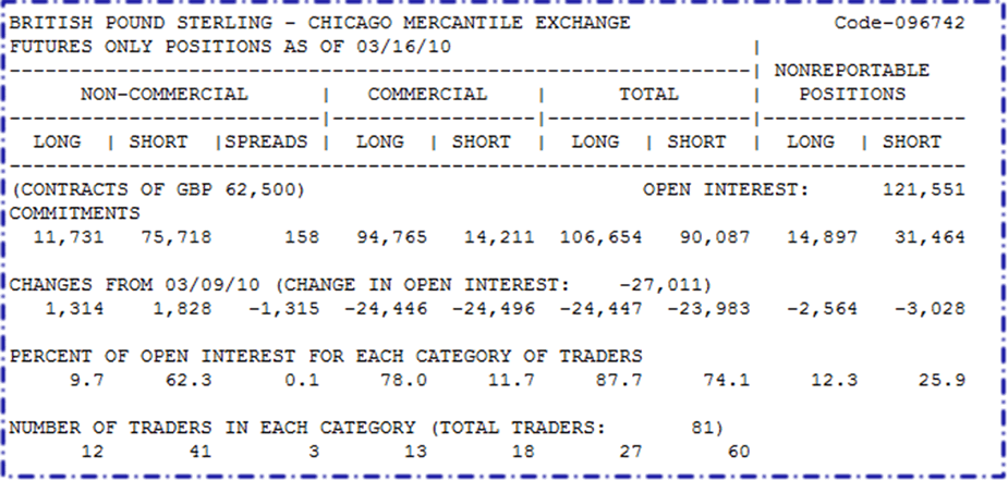 Một báo cáo COT sẽ chỉ ra diễn biến của các giao dịch hàng hóa với các thông số mua, bán và mức chênh lệch mua bán cho các nhà giao dịch thương mại, phi thương mại và các nhà giao dịch nhỏ lẻ.