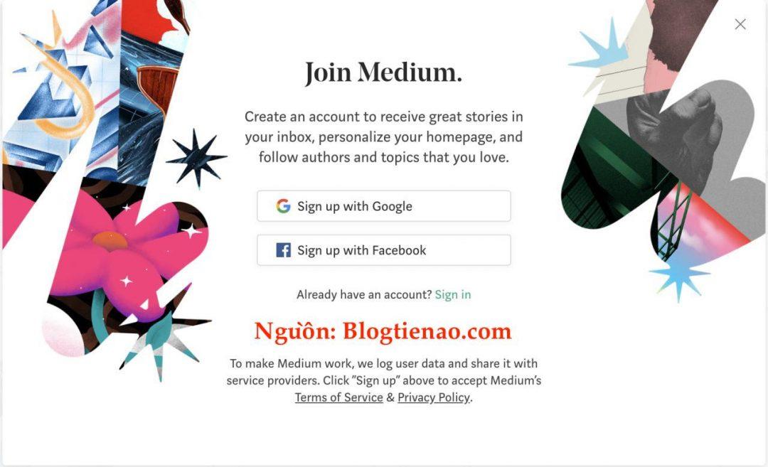 Chúng ta hãy thử thằng Medium trước nhé, Các bạn vào Medium.com, Sau đó chọn “Get Started” Ở góc bên phải trên cùng để tiến hành đăng ký, khá đơn giản.