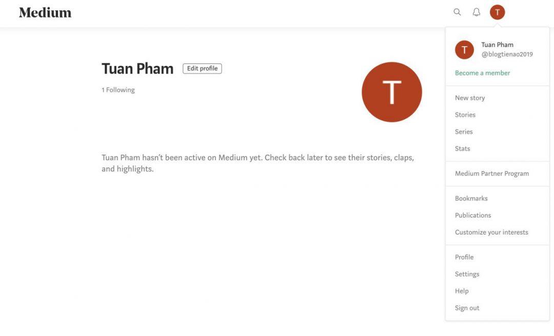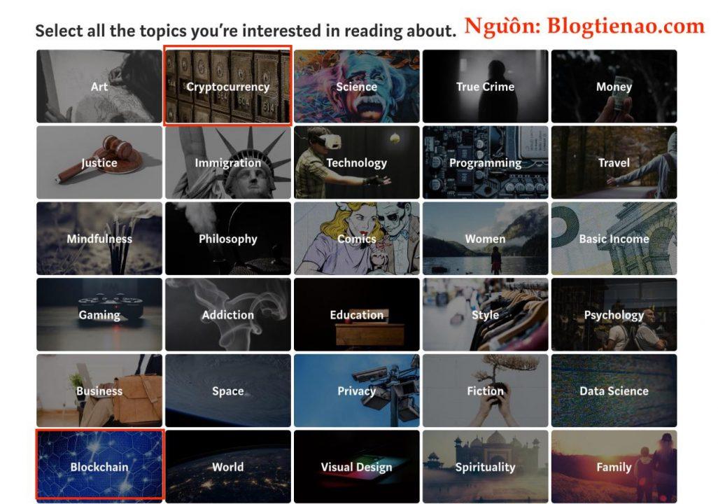 Các bạn chọn CryptoCurrency, Blockchain, Và cái gì đó cũng được nha. Ví dụ tài khoản mình mới tạo ra là : https://medium.com/@blogtienao_com