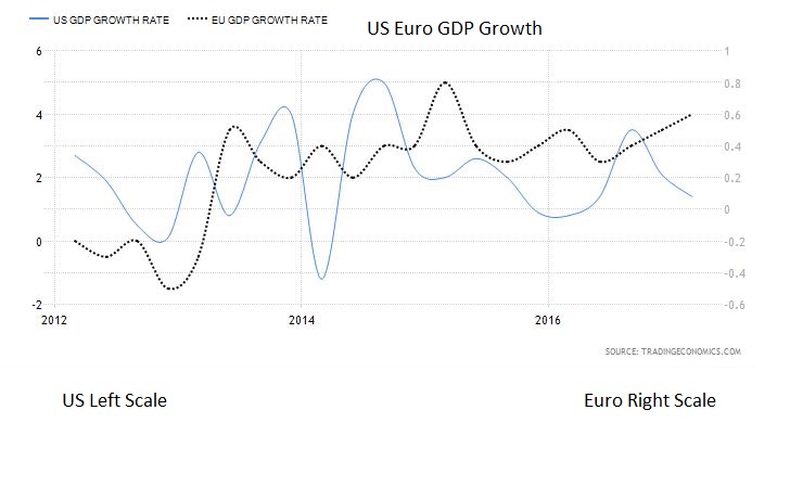 Chính vì thế, theo dõi tăng trưởng GDP, thất nghiệp và lạm phát sẽ cung cấp cho bạn các thông tin cơ bản để giao dịch cặp EURUSD. Đối với các nhà giao dịch trung hạn, với các vị thế mở lệnh kéo dài vài ngày hoặc vài tuần, thì các thông tin này sẽ giúp trader có được ý tưởng tốt xu hướng tiền tệ. Biểu đồ trên cho thấy sự tăng trưởng GDP của Mỹ và Euro từ năm 2012 đến 2017.