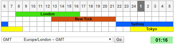 Các hình chữ nhật màu xanh luôn cao hơn, cho thấy phạm vi giao dịch tại những khung giờ đó luôn lớn hơn. Các hình chữ nhật màu xanh hiển thị phạm vi giao dịch của phiên London mở cửa lúc 7 giờ sáng GMT đóng cửa lúc 4 giờ chiều GMT; những giờ giao dịch này cũng trùng với giờ mở cửa của phiên New York lúc 12 giờ GMT.