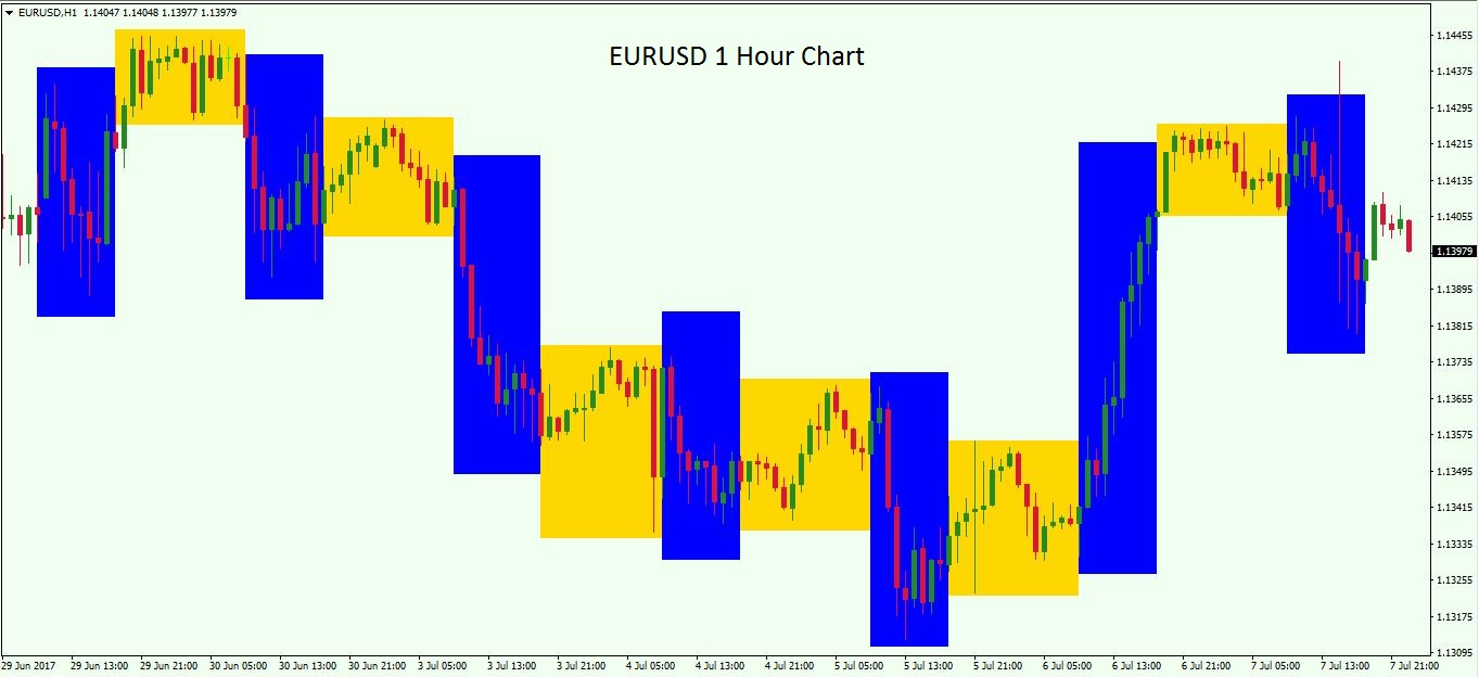 Biểu đồ trên cho thấy 7 phiên giao dịch từ ngày 29 tháng 6 năm 2017, trên khung thời gian nến 1 giờ. Có thể thấy giao dịch EURUSD có xu hướng biến động mạnh hơn qua các giai đoạn được đánh dấu bằng hình chữ nhật màu xanh, so với các giai đoạn được vẽ bằng hình chữ nhật màu vàng.
