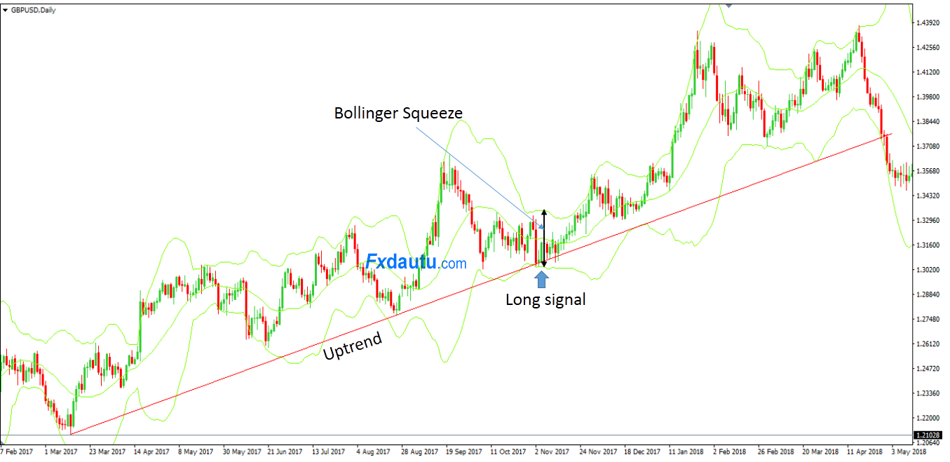 Khi Upper Band và Lower Band co thắt lại thì đó là dấu hiệu cảnh báo sắp có một sự biến động giá mạnh trong tương lai sắp tới, lúc này chúng ta kết hợp với đường xu hướng thì khả năng sẽ cao hơn.