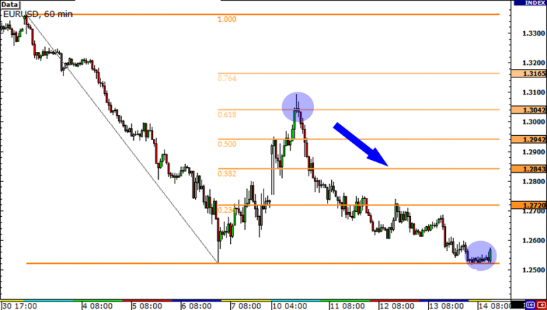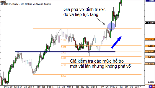 Khi giá đảo chiều, các ngưỡng hỗ trợ hoặc kháng cự mới thường nằm trên hoặc gần đường fibo này. Cùng xem ví dụ với đồ thị dưới với ngưỡng hỗ trợ và kháng cự xuất hiện tại đường Fibonacci 23.6% và 38.2%).