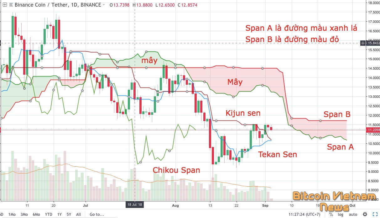 Có thể bạn sẽ thấy hơi khó hiểu một chút. Cụ thể, Senkou Span B sử dụng giá cao nhất và thấp nhất của 52 phiên (2 tháng cuối) và thể hiện trên biểu đồ bằng cách dịch chuyển về trước 26 phiên, như Senkou Span B. Từ đó tạo ra thành phần thứ 6, cũng là thành phần nổi bật nhất trên biểu đồ chỉ báo Ichimoku.