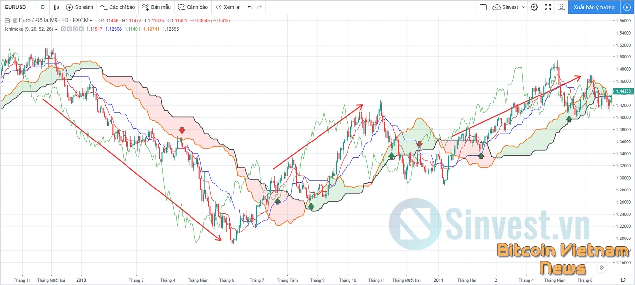 Trong xu hướng tăng đó, nếu xuất hiện đám mây Ichimoku màu đỏ sẽ là báo hiệu cho một sự giảm giá tạm thời hoặc một sự đảo chiều xu hướng. Điều ngược lại tương tự đối với xu hướng giảm.