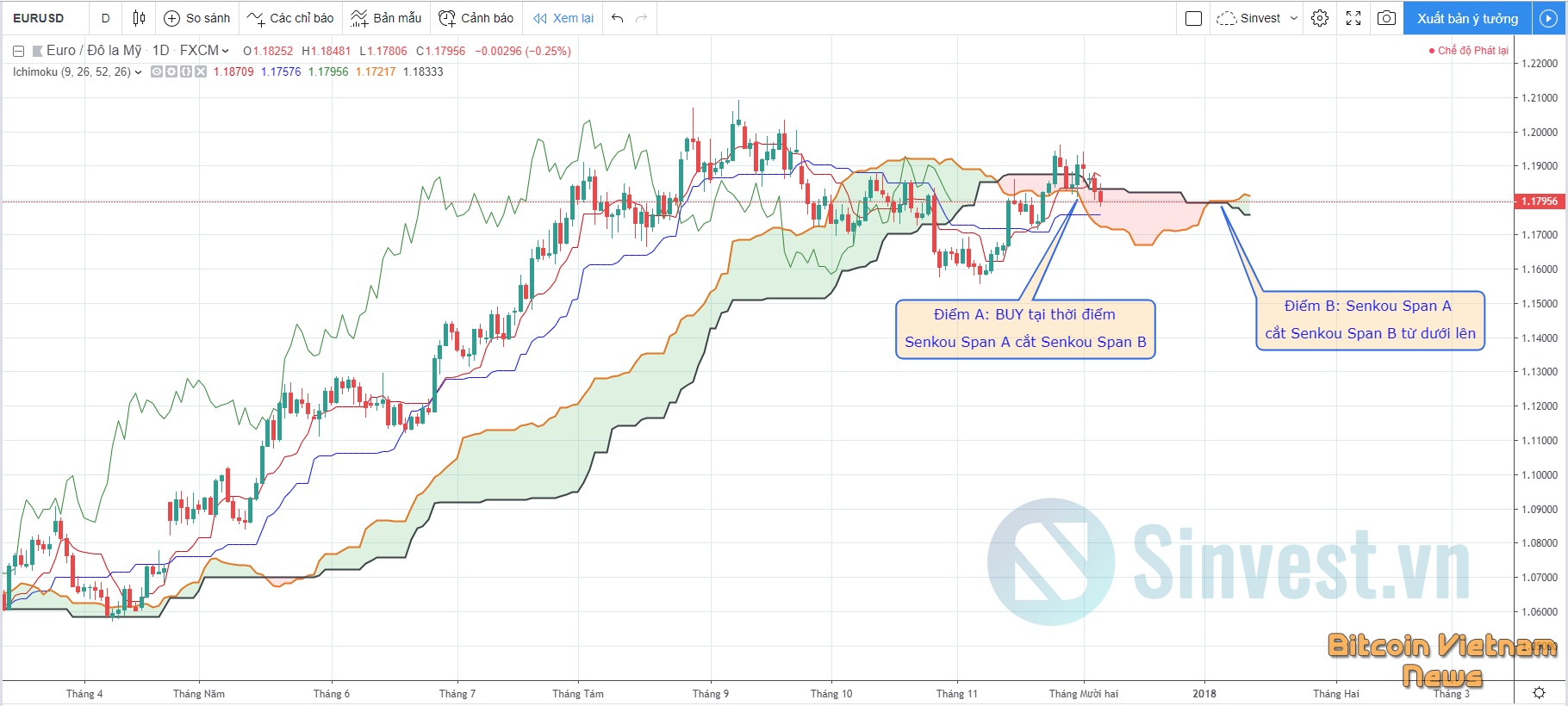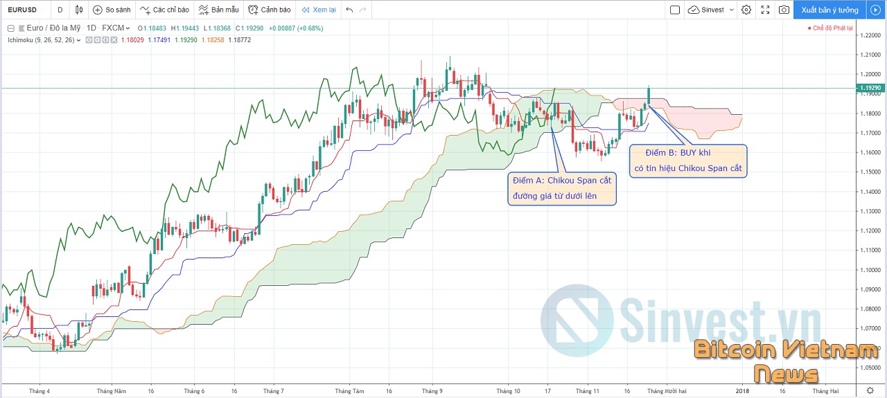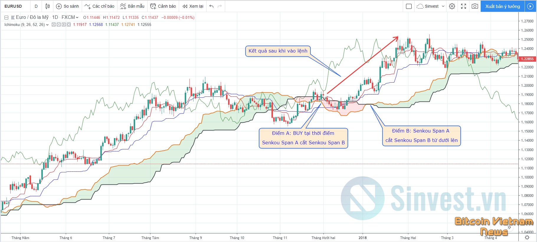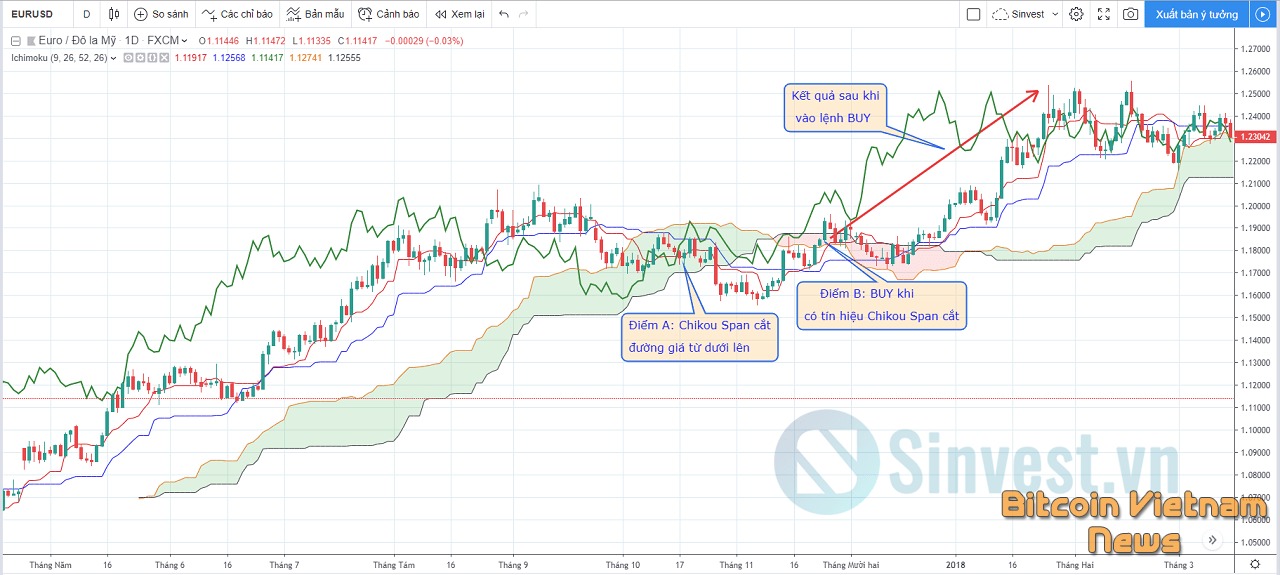 3. Tenkan-Sen cắt Kijun-Sen từ dưới lên (đường chuyển đổi đi lên trên đường tiêu chuẩn)