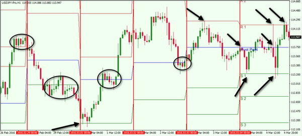 Đây là biểu đồ hàng giờ của cặp USD / JPY từ ngày 29 tháng 2 đến 4 tháng 3 năm 2016. Biểu đồ cho thấy hành động giá của điểm xoay trong 5 ngày liên tiếp. Các vòng tròn hiển thị thời điểm giá hợp nhất và do dự trong khu vực của một điểm xoay.