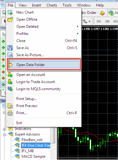 Sau khi mở phần mềm MT4 lên bạn nhấn vào mục Open Data Folder: