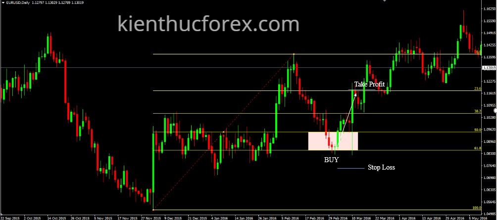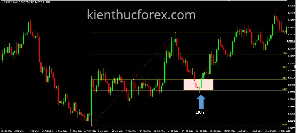 Bước 4: Vào lệnh BUY trong vùng giá 50-61,8 của dải Fibo