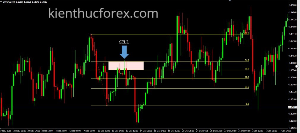 Bước 5: Vùng 50-61,8 của Fibo chính là vùng dự đoán sẽ tạo ra đỉnh mới