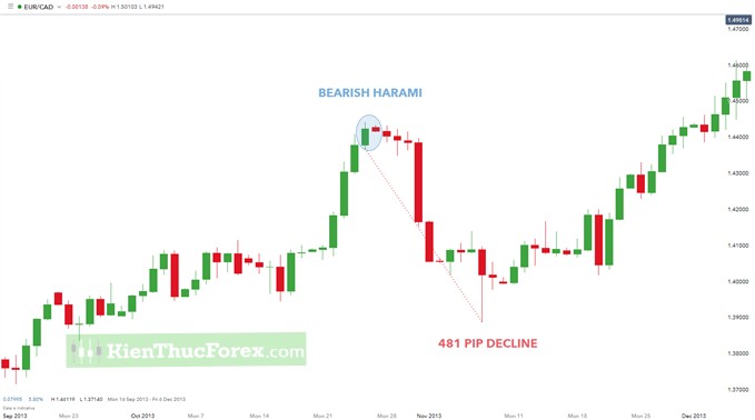 Biểu đồ trên là của cặp tiền tệ forex EUR/CAD khung D1 cho thấy ECAD đang nằm trong xu hướng tăng và giá có xu hướng muốn điều chỉnh và hành động này đã thành hiện thực khi mà mô hình nến Harami đã xuất hiện và giảm 480 pips!