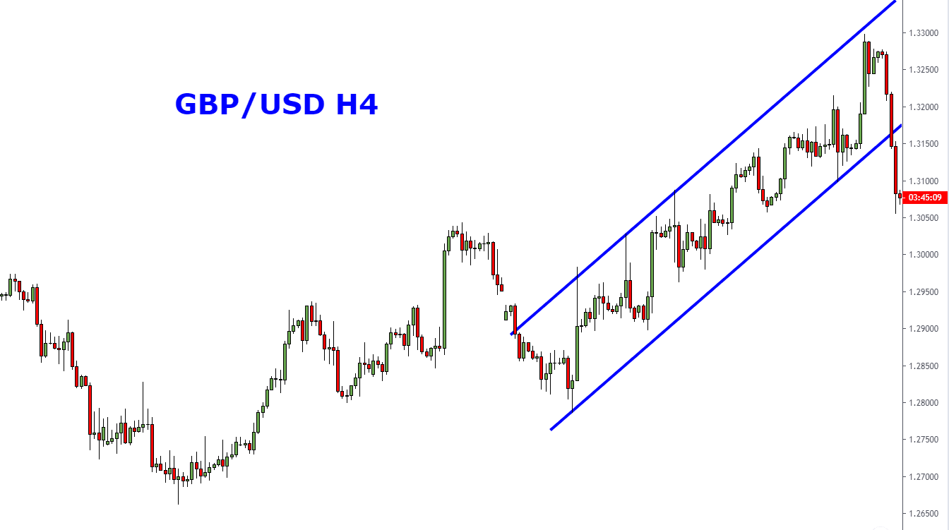 Khi quan sát cặp GBP/USD khung thời gian H4, bạn thấy rằng kênh xu hướng tăng đã bị phá vỡ với lực xuống rất mạnh.