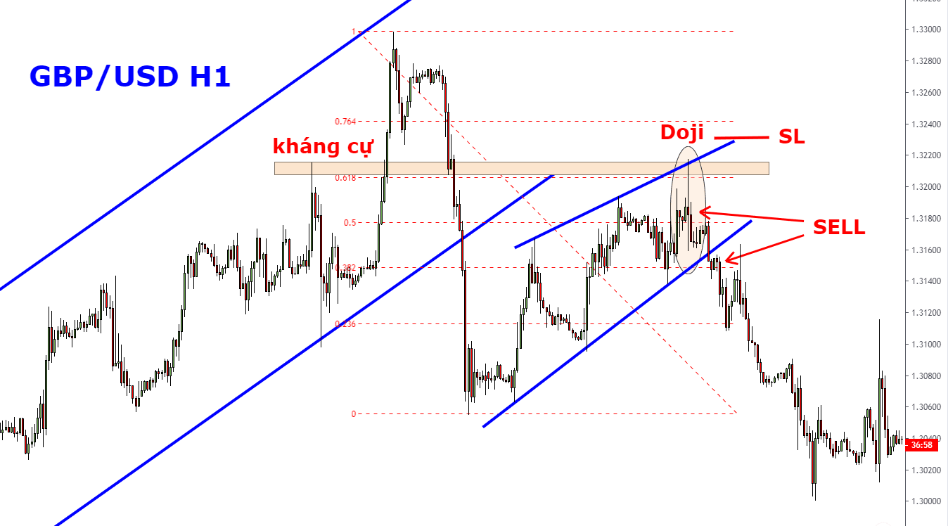 Tại mức Fibonacci Retracement 0.5 có một ngưỡng kháng cự và một cây nến Doji với đuôi nến rất dài. Đây là một tín hiệu SELL không thể đẹp hơn sau khi đóng nến Doji. Stop loss ngay trên đỉnh nến Doji còn Take profit bạn có thể đặt theo nhiều cách khác nhau.