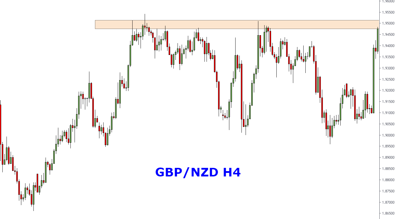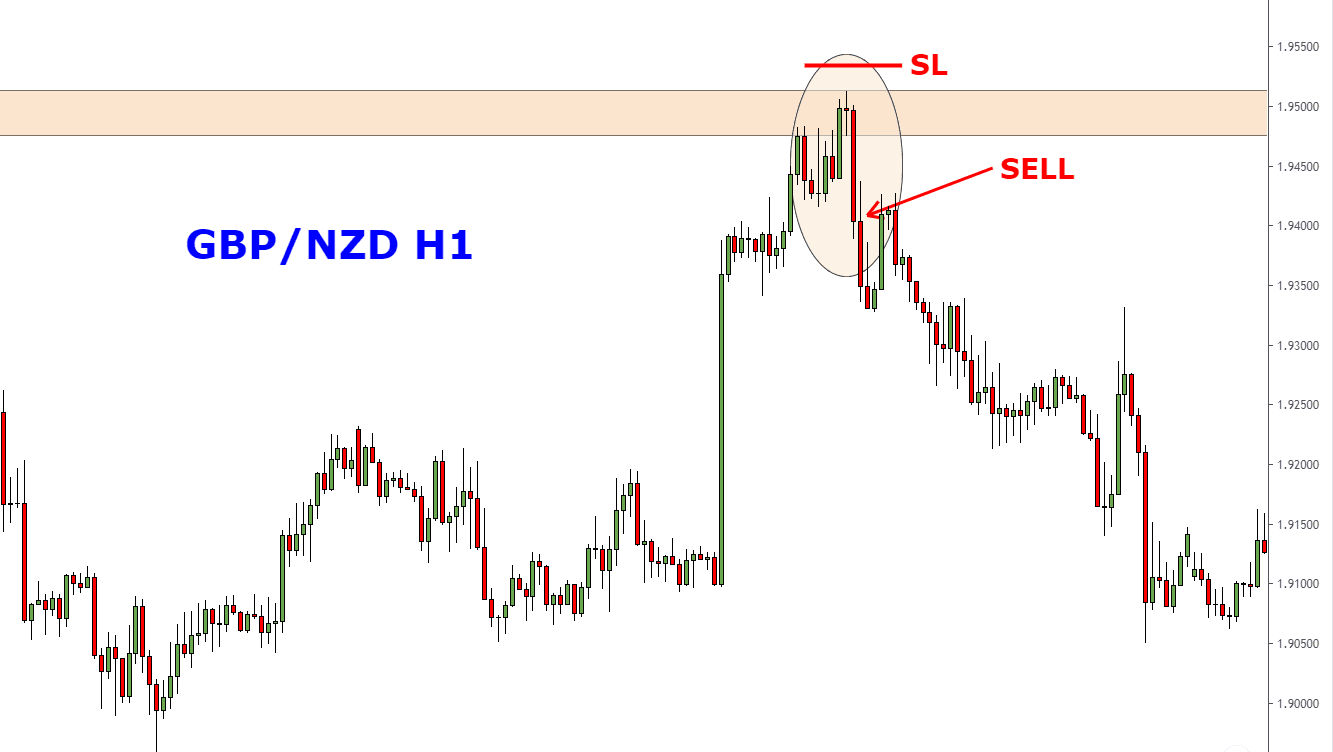 Bạn quan sát cặp GBP/NZD trên khung H4 và thấy rằng có một vùng kháng cự rất mạnh khi mà ở lần “thử sức” trước, giá không thể phá nổi vùng kháng cự và quay đầu.