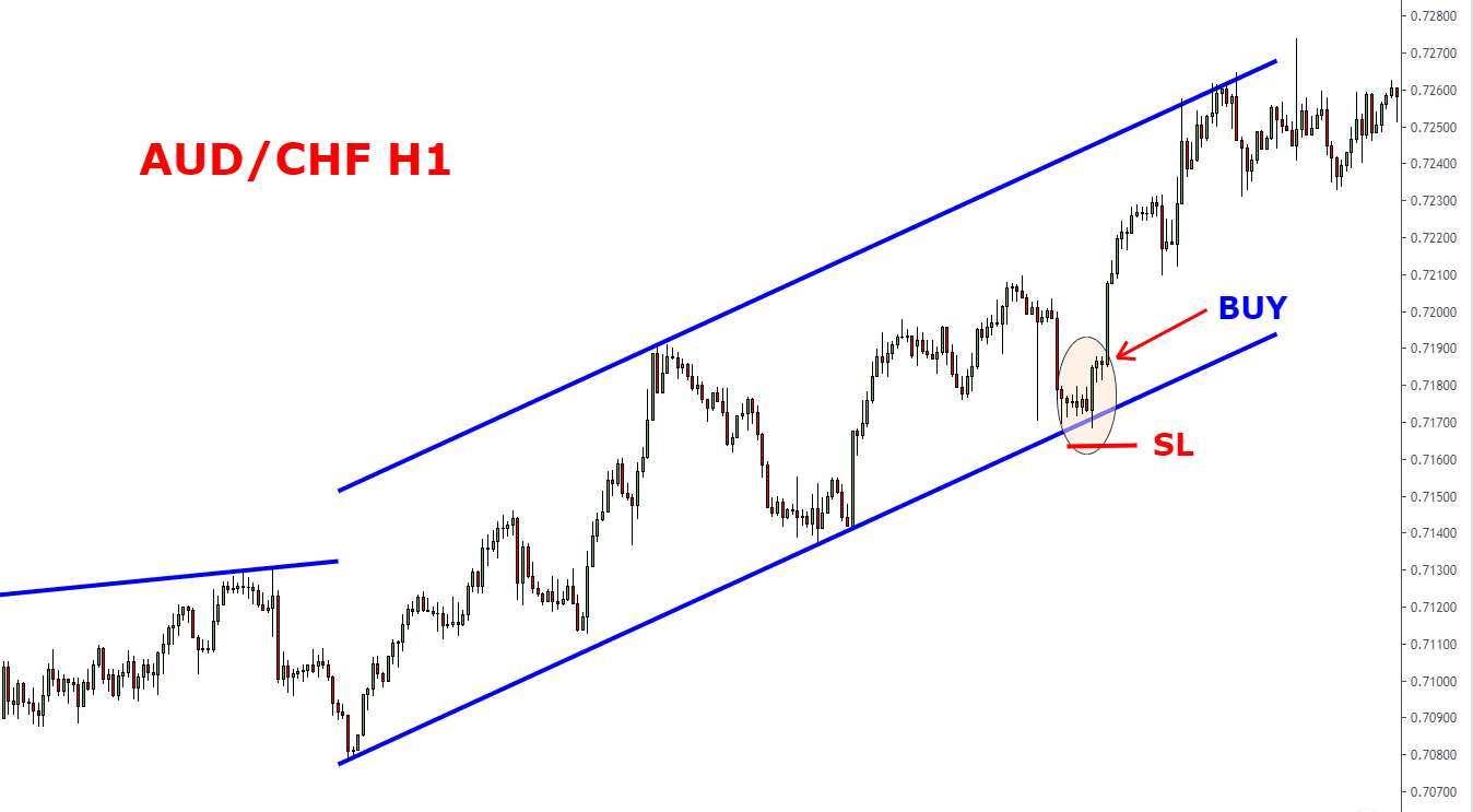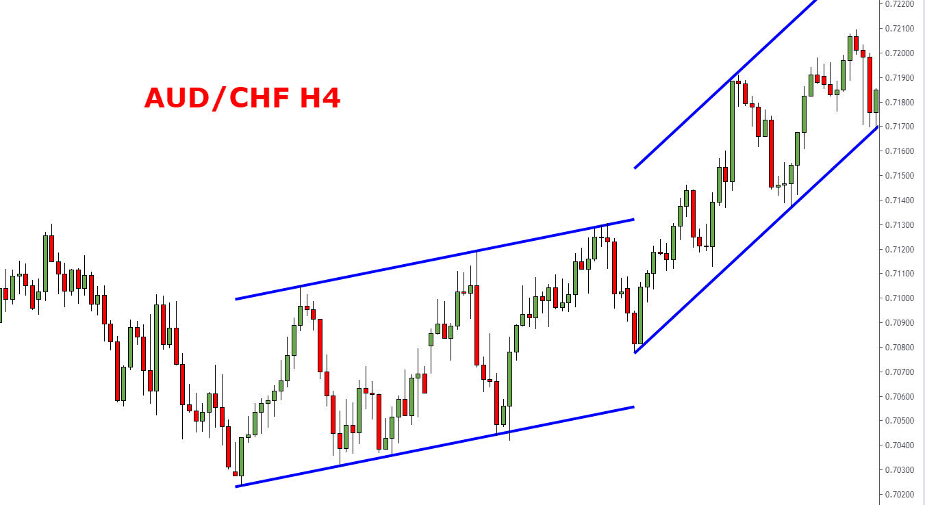 Quan sát cặp AUD/CHF khung thời gian H4, bạn thấy rằng xu hướng tăng đang rất mạnh mẽ. Bạn muốn tìm một lệnh giao dịch thuận theo xu hướng.