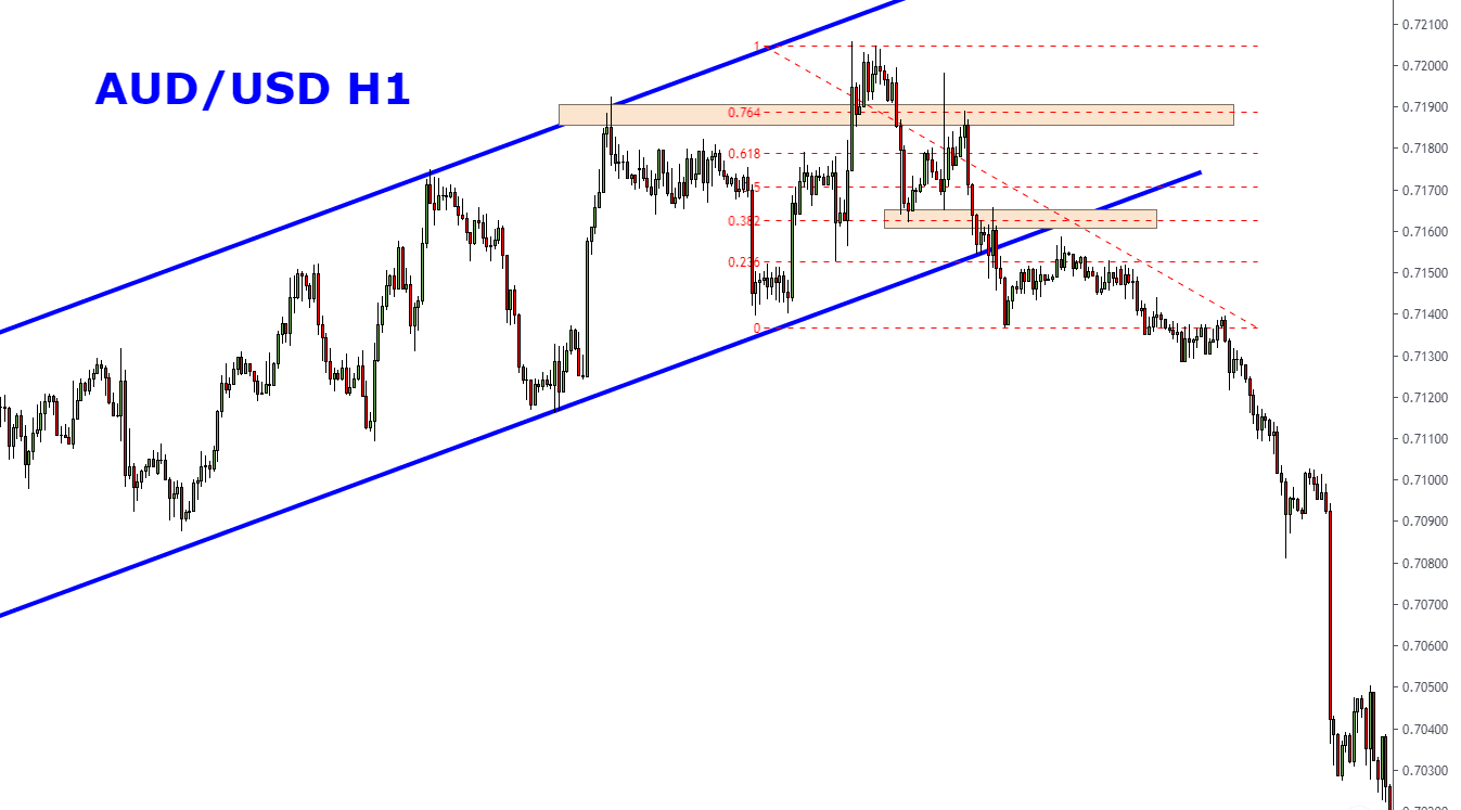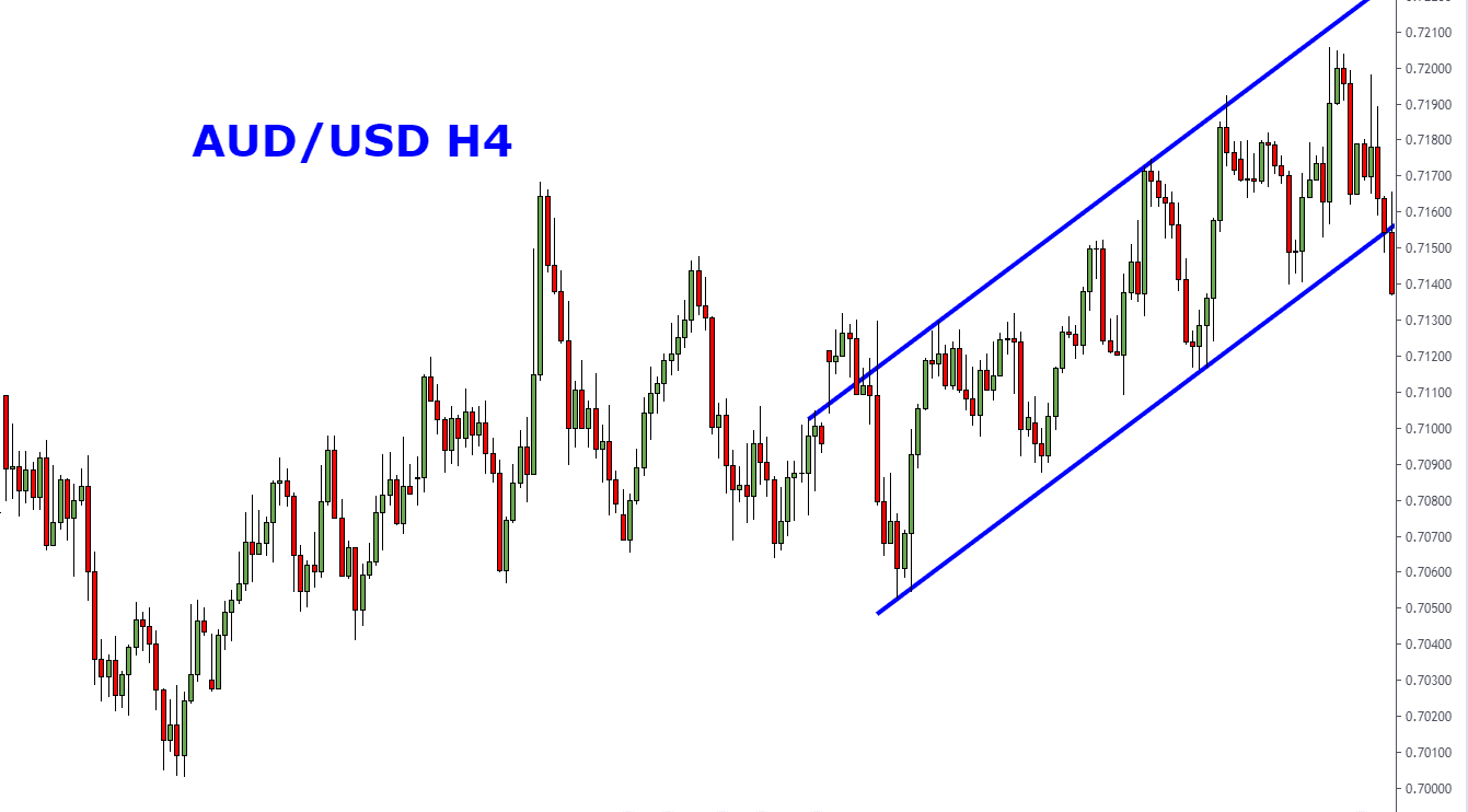 Khi quan sát cặp AUD/USD trên khung H4, bạn thấy kênh xu hướng tăng đã bị phá vỡ, bạn sẽ làm gì?