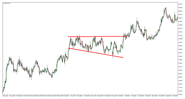 - Ban đầu giá đi trong một phạm vi hẹp, sau đó mở rộng phạm vi ra nhưng vẫn nằm trong 2 đường kháng cự/hỗ trợ.