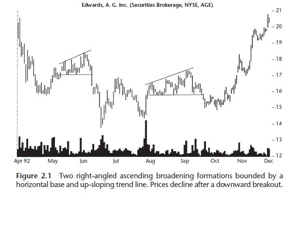 Dưới đây là một ví dụ về mô hình Right Angled Broadening & Ascending. Cả hai lần xuất hiện, Right Angled Broadening & Ascending đều kết thúc bằng một cú phá xuống trong đó lần thứ nhất giá giảm sâu hơn, lần thứ hai giá chỉ giảm khoảng một nửa chiều cao của mô hình.