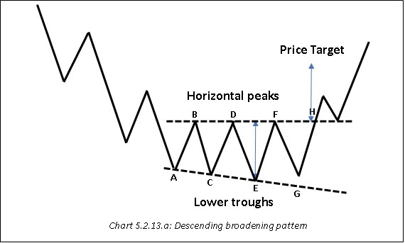 Dưới đây là một ví dụ về mô hình Right Angled Broadening & Descending. Sau vài lần bật qua lại giữa đường hỗ trợ và kháng cự, cuối cùng giá đã phá lên đường hỗ trợ nằm ngang rồi tăng lên trên.