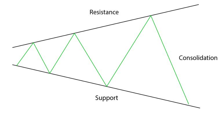 Broadening Top xuất hiện trong xu hướng tăng. Nếu nối các đỉnh của mô hình với nhau, ta thu được đường kháng cự. Nếu nối các đáy của mô hình với nhau, ta thu được đường hỗ trợ.