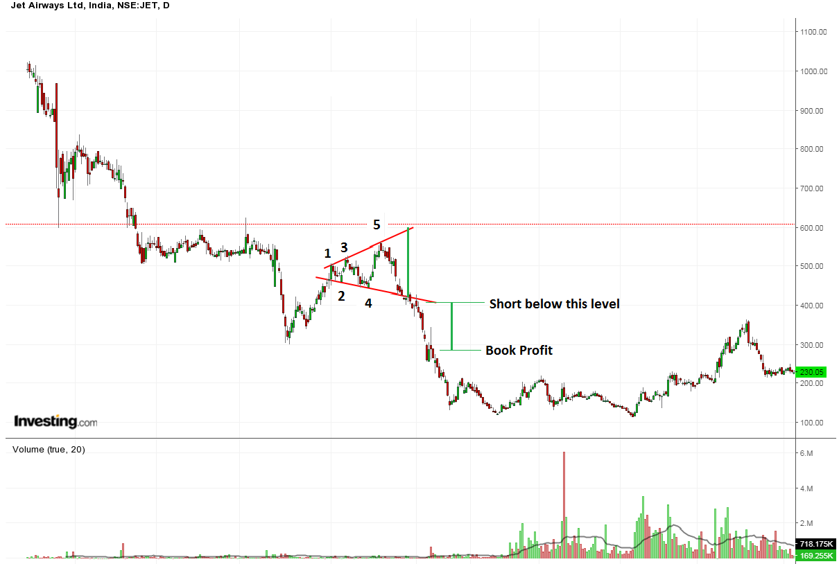 Ngay khi giá giảm xuống thấp hơn đỉnh số 3 được đánh dấu trên màn hình, chúng ta vào lệnh bán. Khi đó, điểm chốt lời nằm ở các đáy bên dưới và mức dừng lỗ nằm bên trên điểm số 5.