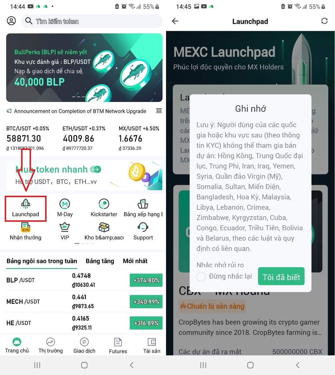 Bước 2: Truy cập vào mục Launchpad ở phần trang chủ của app MEXC và đọc kỹ phần lưu ý.