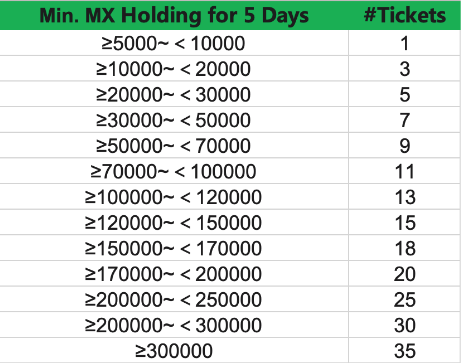 • Số token MX trung bình mà người dùng hold sẽ được sử dụng để xác định số lượng vé mà người dùng có thể nhận được. Snapshot sẽ được chụp ngẫu nhiên nhiều lần mỗi ngày.
