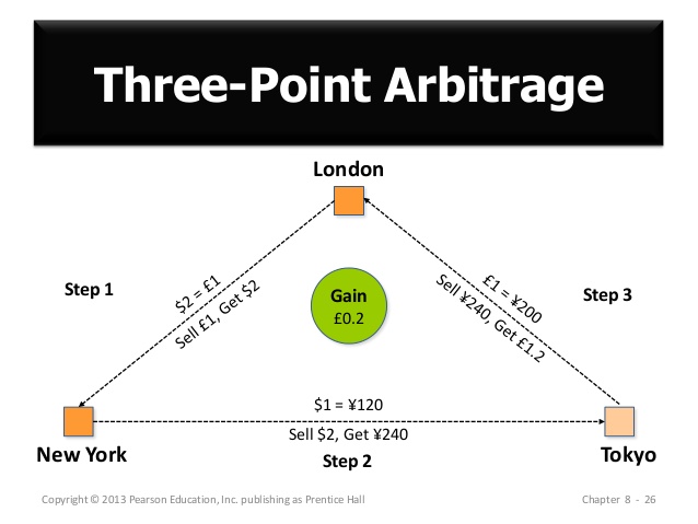 2. Arbitrage ba điểm/ tam giác (Three Points Arbitrage): trường hợp này nhìn bề ngoài chưa thấy sự khác nhau trong tỷ giá giữa các thị trường. Nhưng thực ra có thể nhận thấy sự chênh lệch tỷ giá thông qua tỷ giá chéo.