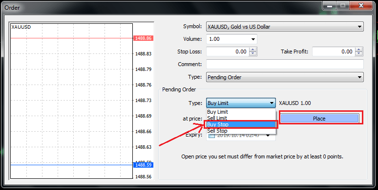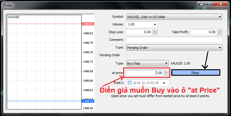 Bước tiếp theo bạn điền giá muốn Buy Stop vào ô “at price”. Sau đó chọn Place là xong.