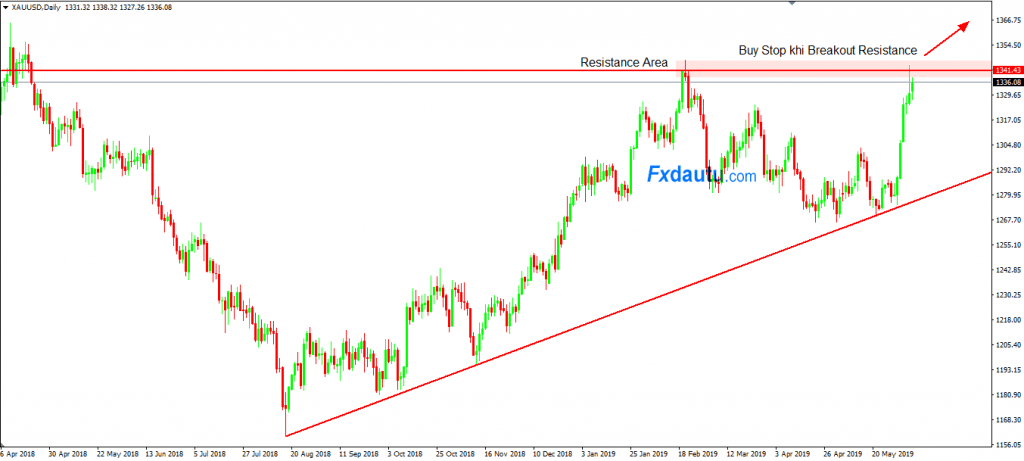 Tuy nhiên giá vàng đang ở gần vùng kháng cự (Resistance Area) với mức giá 1341.43.