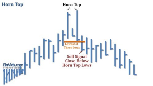 Đối với mô hình Horn Top, tín hiệu bán sẽ được đưa ra khi giá giảm xuống và phá qua đáy sừng. Tại đây, mục tiêu giá của mô hình sẽ bằng khoảng 75% chiều cao của mô hình, tính từ điểm breakout xuống dưới.