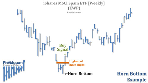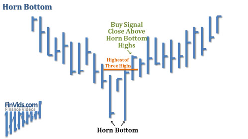 Ngược lại, Horn Bottom (Cặp Sừng Tại Đáy) là mô hình đảo chiều gồm 3 thanh giá trong đó 2 thanh ở hai bên giật xuống thấp với vùng đáy gần bằng nhau trong khi thanh ở giữa ngắn và có đáy cao hơn. Hình ảnh của Horn Top trông giống như cặp sừng của một con bò hướng xuống dưới.