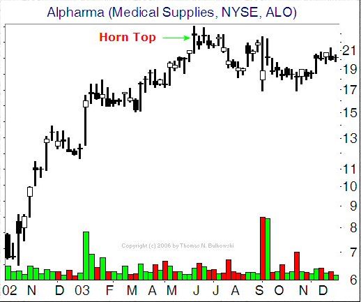 Bên dưới là ví dụ thực tế của mô hình Horn Top. Sau một xu hướng tăng rất mạnh trước đó, mô hình Horn Top đã được hình thành với 2 thanh giá giật cao với 2 đỉnh gần bằng nhau, tạo ra một ngưỡng kháng cự. Thị trường sau đó đã không còn tăng mạnh nữa và giảm nhẹ xuống dưới.