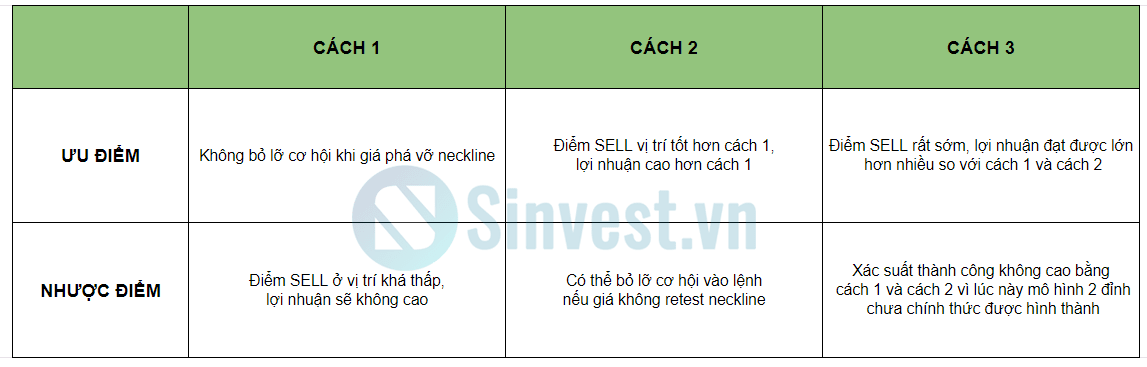 Cách 2: Điểm SELL tốt hơn dẫn đến lợi nhuận tốt hơn cách 1 nhưng có thể bỏ lỡ cơ hội nếu giá không retest neckline.