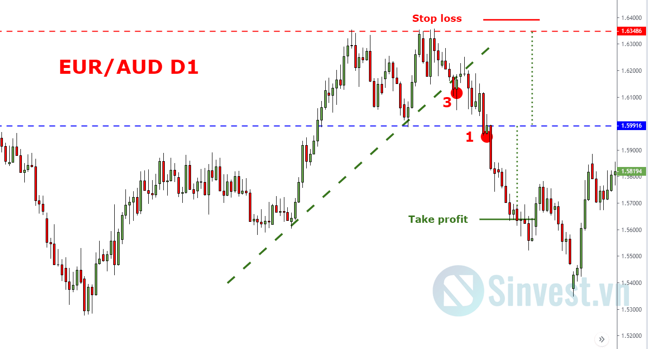 Điểm vào: SELL ngay khi giá phá vỡ hỗ trợ ở đường neckline. Đây chính là điểm SELL đánh số 1 trên hình.
