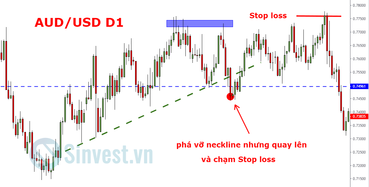 Ví dụ về mô hình Hai Đỉnh – Double Top xuất hiện trên cặp AUD/USD khung D1. Giá sau khi phá vỡ neckline ngay lập tức quay lên đá đít bạn. Dính Stop loss!