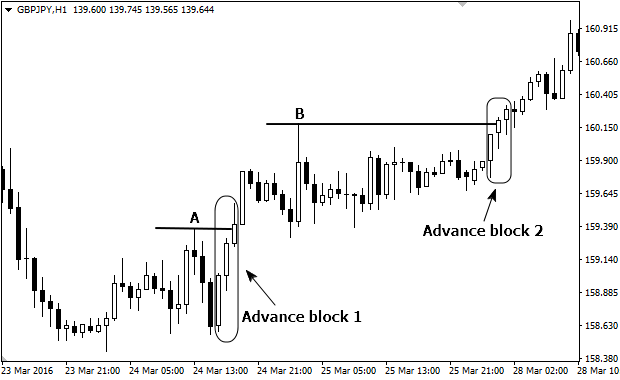 Như vậy Advance Block Pattern đã được tạo ra và sau khi mẫu hình này hoàn tất, cặp GBPJPY tuy vẫn tiếp tục tăng nhưng sau đó trở nên yếu hơn và đi ngang trong một khoảng thời gian.