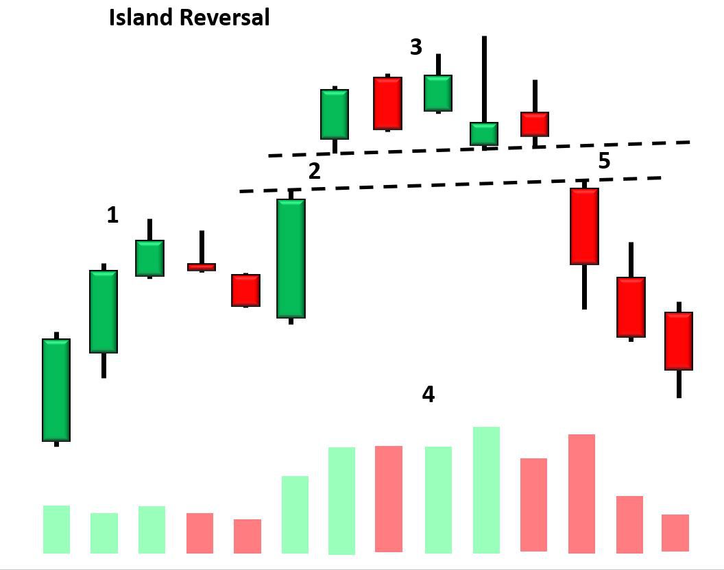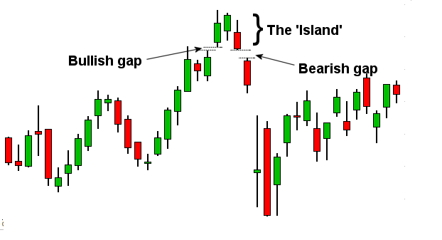 Đầu tiên là hình ảnh về mô hình Island Reversal xuất hiện trong xu hướng tăng. Như bạn có thể quan sát, sau một đợt tăng giá, biểu đồ tạo ra một gap tăng (Bullish gap), theo sau đó là cụm 3 nến nằm trong một phạm vi trông như một hòn đảo ngoài khơi xa. Mô hình kết thúc bằng việc tạo gap giảm (Bearish gap) và đi xuống.