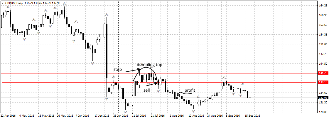 Dưới đây là một ví dụ cách vào lệnh bán đối với mô hình Dumpling Top trên biểu đồ GBPJPY, khung thời gian ngày.