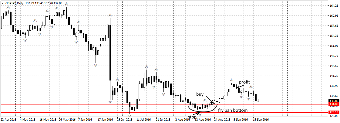 Dưới đây là một ví dụ cách vào lệnh mua đối với mô hình Fry Pan Bottom trên cùng một biểu đồ GBPJPY vừa nhắc đến ở trên. Biểu đồ này khá thú vị khi tạo ra hai mô hình của chúng ta liên tiếp.