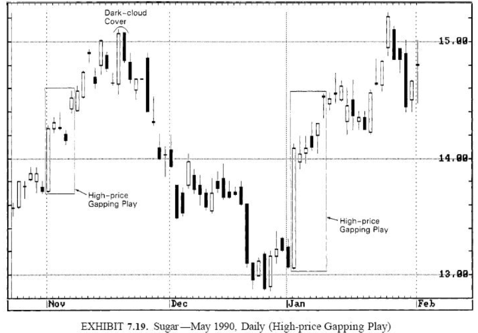 Trong biểu đồ bên dưới, chúng ta thấy sau khi mô hình High Price Gapping Play xuất hiện lần thứ nhất, giá sau đó tiếp tục tăng cho đến khi gặp phải mô hình đảo chiều Dark Cloud Cover.