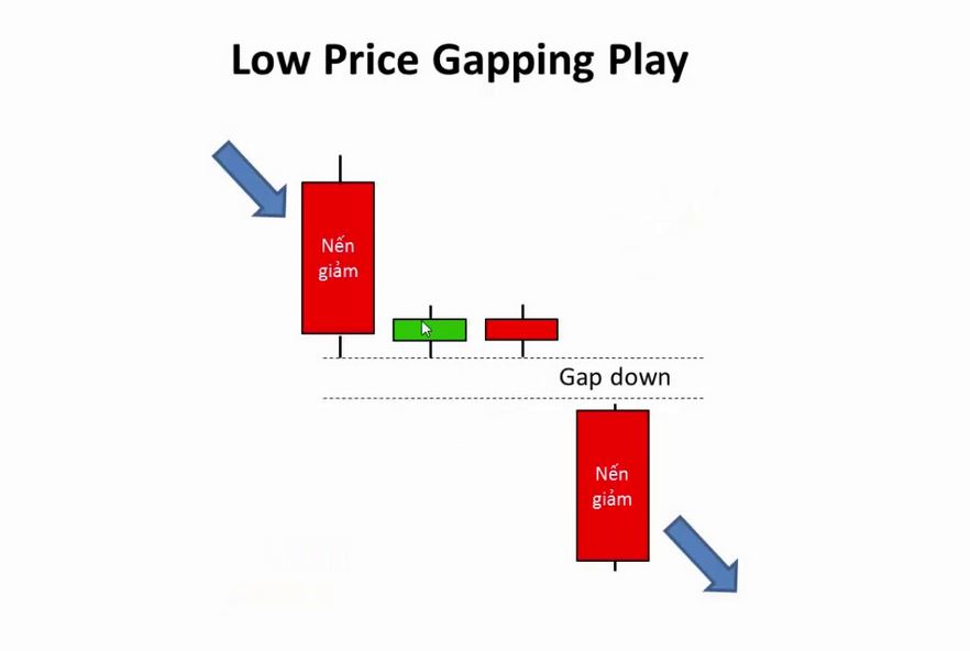 Đối ngược với High Price Gapping Play (Khoảng trống giá ở đáy) là mô hình Low Price Gapping Play (Khoảng trống giá ở đáy). Mô hình này bắt đầu với một nến giảm mạnh, sau đó là một giai đoạn đi ngang tích lũy với những cây nến thân ngắn.