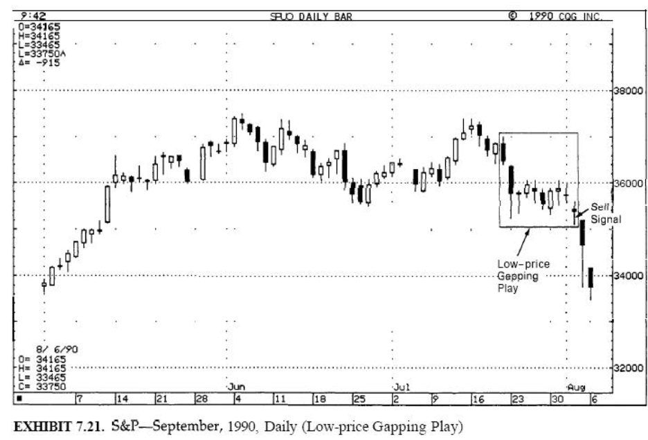 Cuối cùng, Low Price Gapping Play tạo ra một khoảng trống (gap) và kết thúc bằng một cây nến giảm mạnh (tham khảo hình minh hoạ).