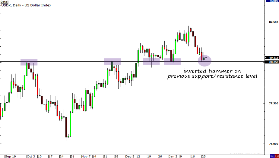 Dưới đây làm một ví dụ về mô hình trên biểu đồ ngày của chỉ số USDX. Sau một chuỗi nến đỏ thân dài, thị trường tiến về vùng hỗ trợ và tạo ra một cây nến Inverted Hammer, theo sau là một nến Doji, cả hai đều mang tín hiệu đảo chiều.